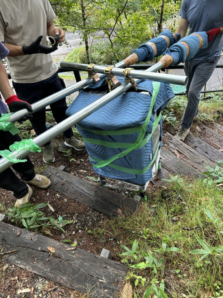 今回の納品は車を建物に横付けできず担いで40mの坂道や階段を登り運びました。